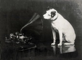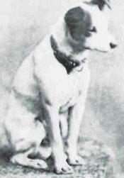 Actual photograph of Nipper referenced by Francis Philip Barraud to paint "His Master's Voice" above in 1898, three years after Nipper passed.